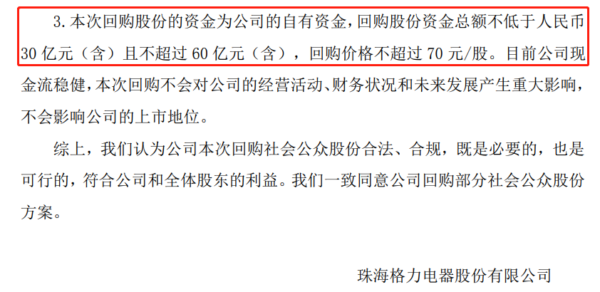 10月13日晚间,格力电器(000651)发布公告称,公司单一第一大股东珠海明骏提议回购公司股份,公司拟以自有资金回购部分社会公众股份,回购资金总额不低于30亿元,且不超过60亿元,回购价格不超过70元/股。